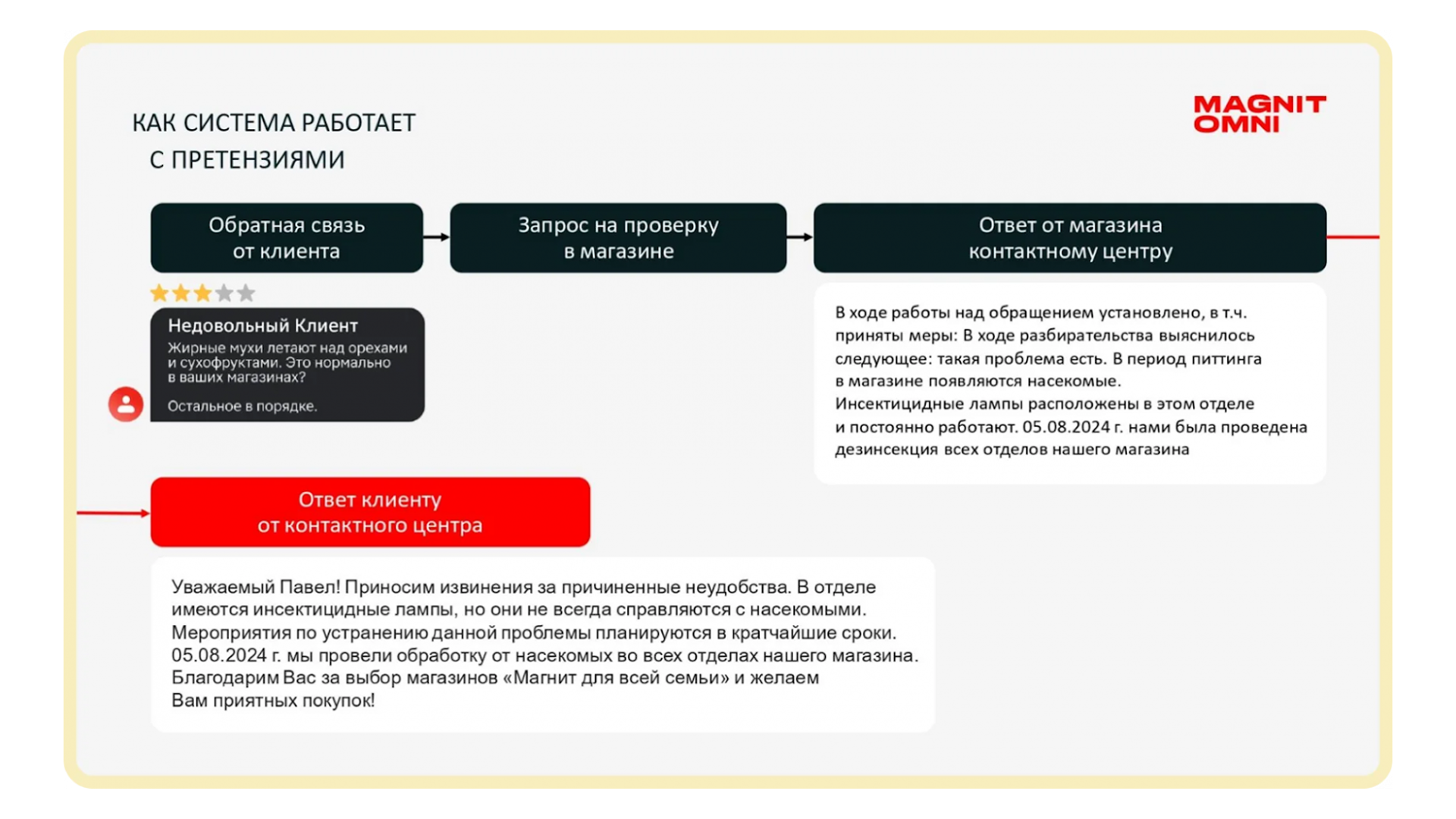 • «Магнит» внедрил AI-систему для работы с отзывами. Система классифицирует по 80-ти критериям десятки тысяч отзывов в день и формирует единый дашборд со сводной информацией для аналитики. Кроме того, на каждый отзыв LLM формирует персонализированный ответ с учетом контекста покупки. В итоге менеджмент видит ситуацию на местах, а покупатели получают фидбек.