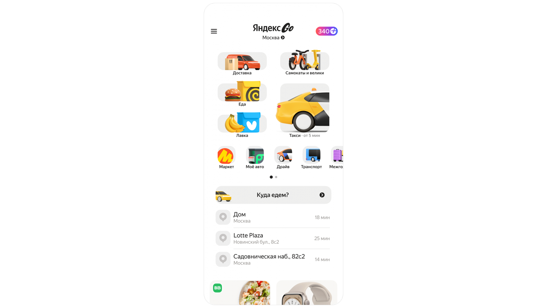 - Yandex Go — экосистема, выстроенная вокруг доставки и разнообразной логистики: такси, еда, каршеринг, маркетплейс. Ежемесячная аудитория (MAU) суперприложения от Яндекс составляет около 47 млн. человек.