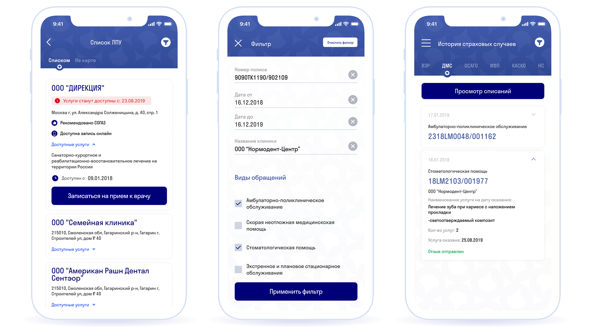 Страховое приложение СОГАЗ с интегрированной возможностью записаться в клинику.