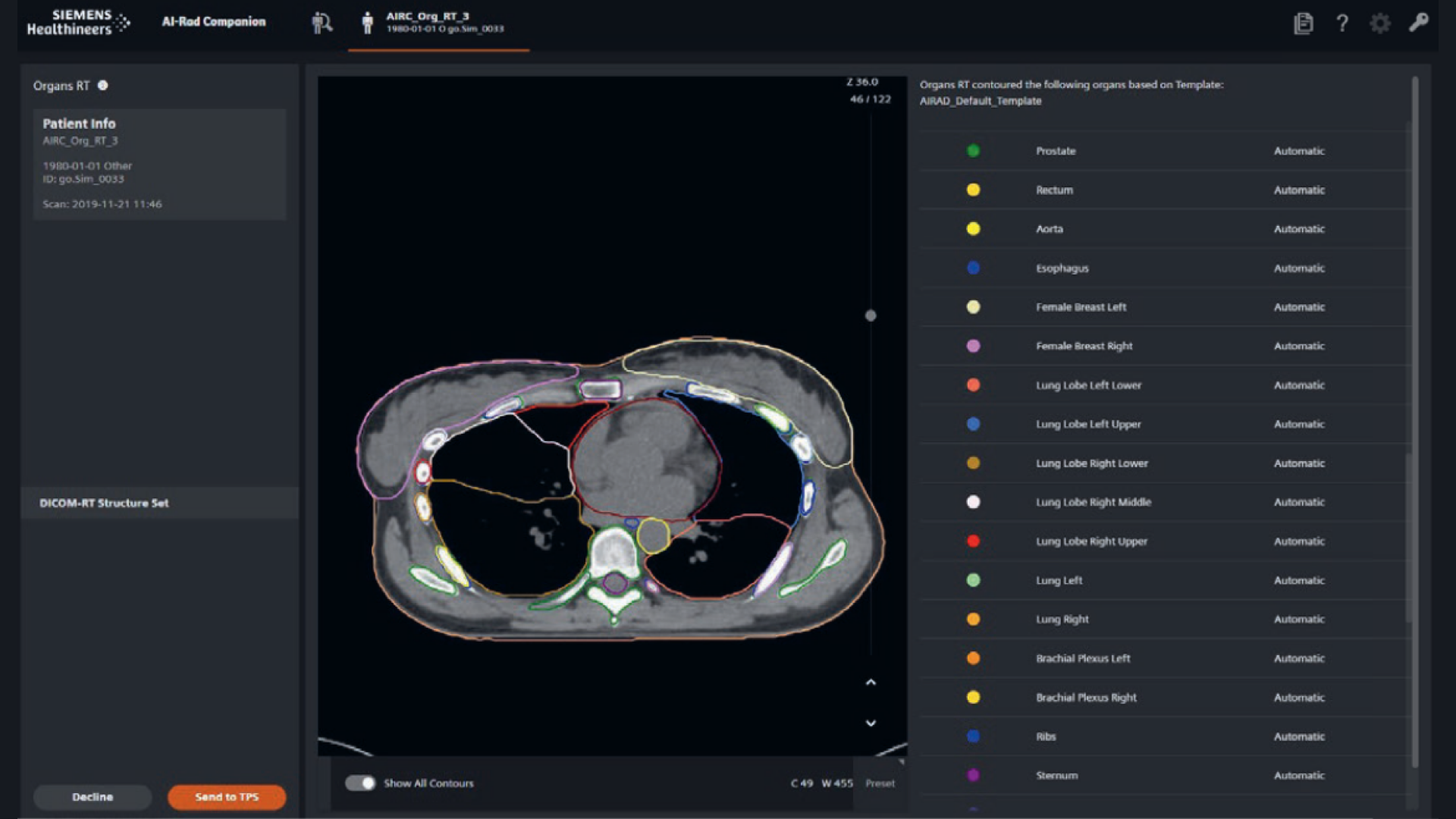 Пример работы системы AI Rad Companion от Siemens. Цветными линиями выделены контуры различных органов на сечении МРТ-снимка. Еще примеры здесь.