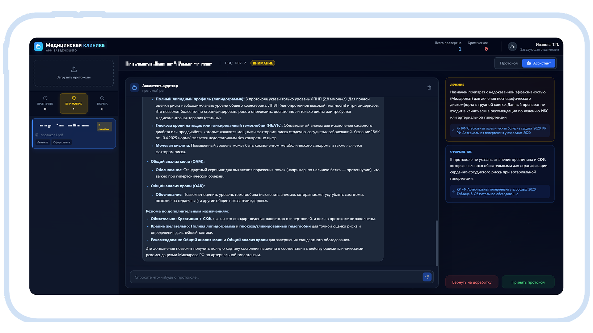 Мы внедрили решение на базе обученной нейросети в комплексе с технологией RAG, что позволило выполнить аудит загруженных документов (в формате docx или даже сканов) буквально в течение минуты! ИИ сам сверяет каждое решение врача с официальными стандартами лечения, подсвечивает грубые ошибки и фрагменты, требующие внимания. Также проверяется правильность оформления каждого медицинского документа и его соответствие правилам самой клиники.