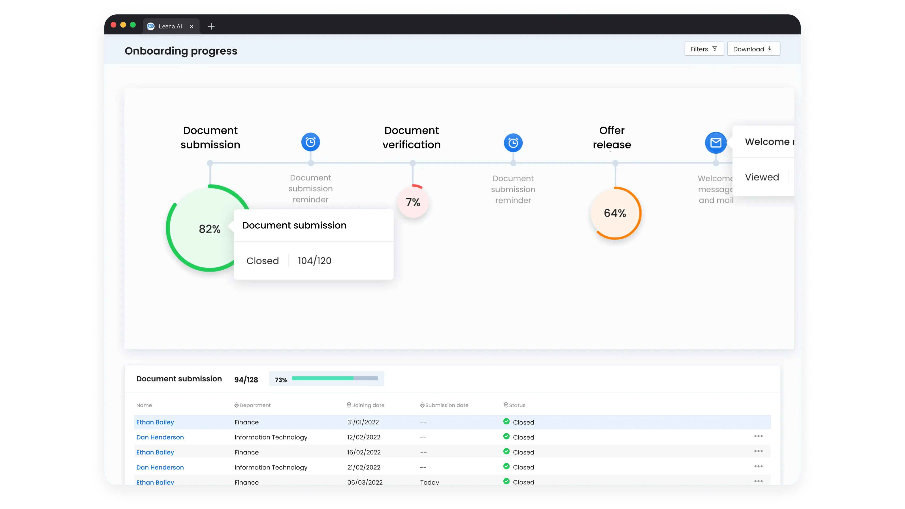 Пример единой панели управления онбордингом персонала. Источник: leena.ai