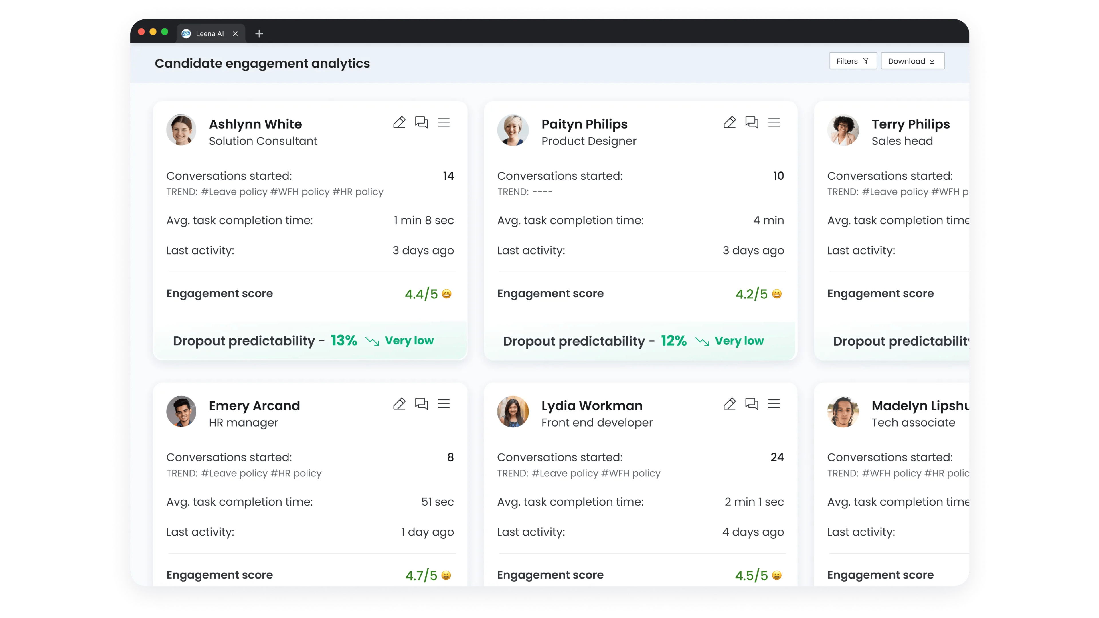 AI-чат бот отвечает на вопросы сотрудников, а система трекает удовлетворенность новых сотрудников. Источник: leena.ai