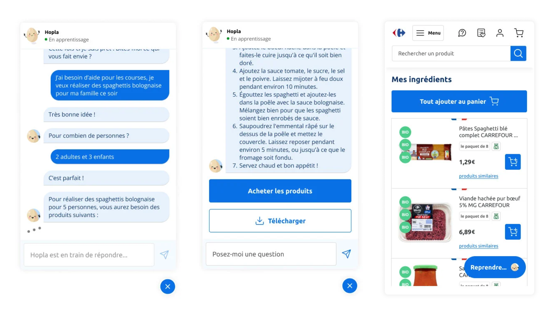 А ассистент Hopla французской сети продуктовых магазинов Carrefour (переводится «перекресток») может собрать корзину на основе диалога с пользователем. «У нас тут планируется вечеринка на 6 человек, что можно приготовить?»