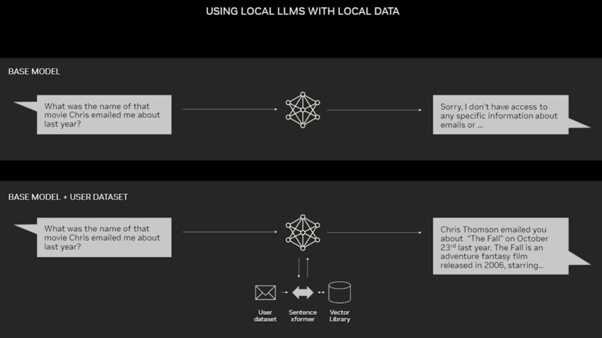 Без RAG нейросеть не дает ответа или выдумывает его. После интеграции RAG нейросеть сверяется с базой данных (в данном случае — история переписки в корпоративном мессенджере или email) и находит релевантную информацию. Источник: NVIDIA