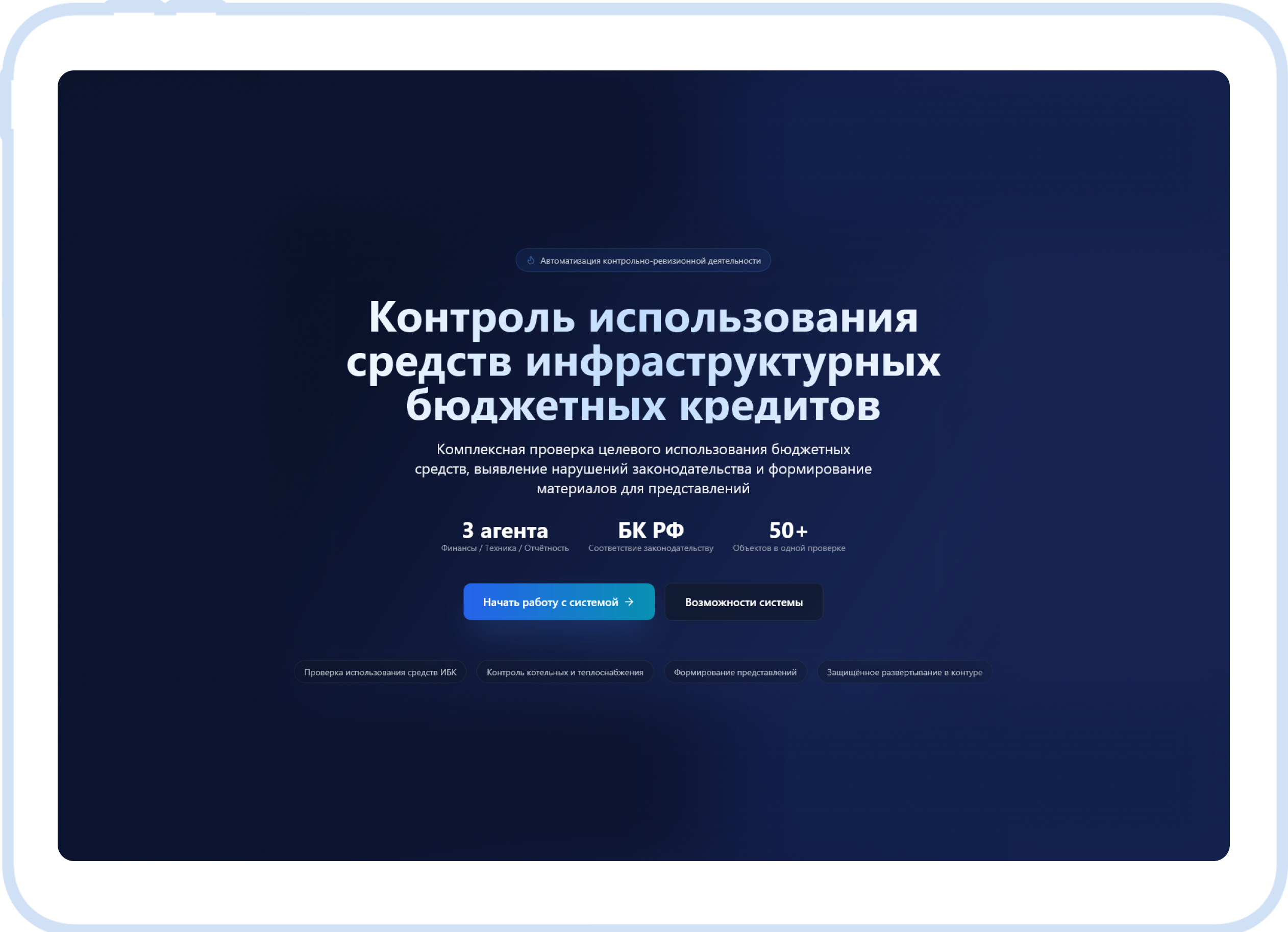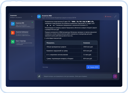 Пилотное решение, комплексный ИИ-ассистент для проверки целевого использования бюджетных средств. Помогает выявлять нарушения законодательства и автоматически формирует материалы для предоставления в различные ведомства.