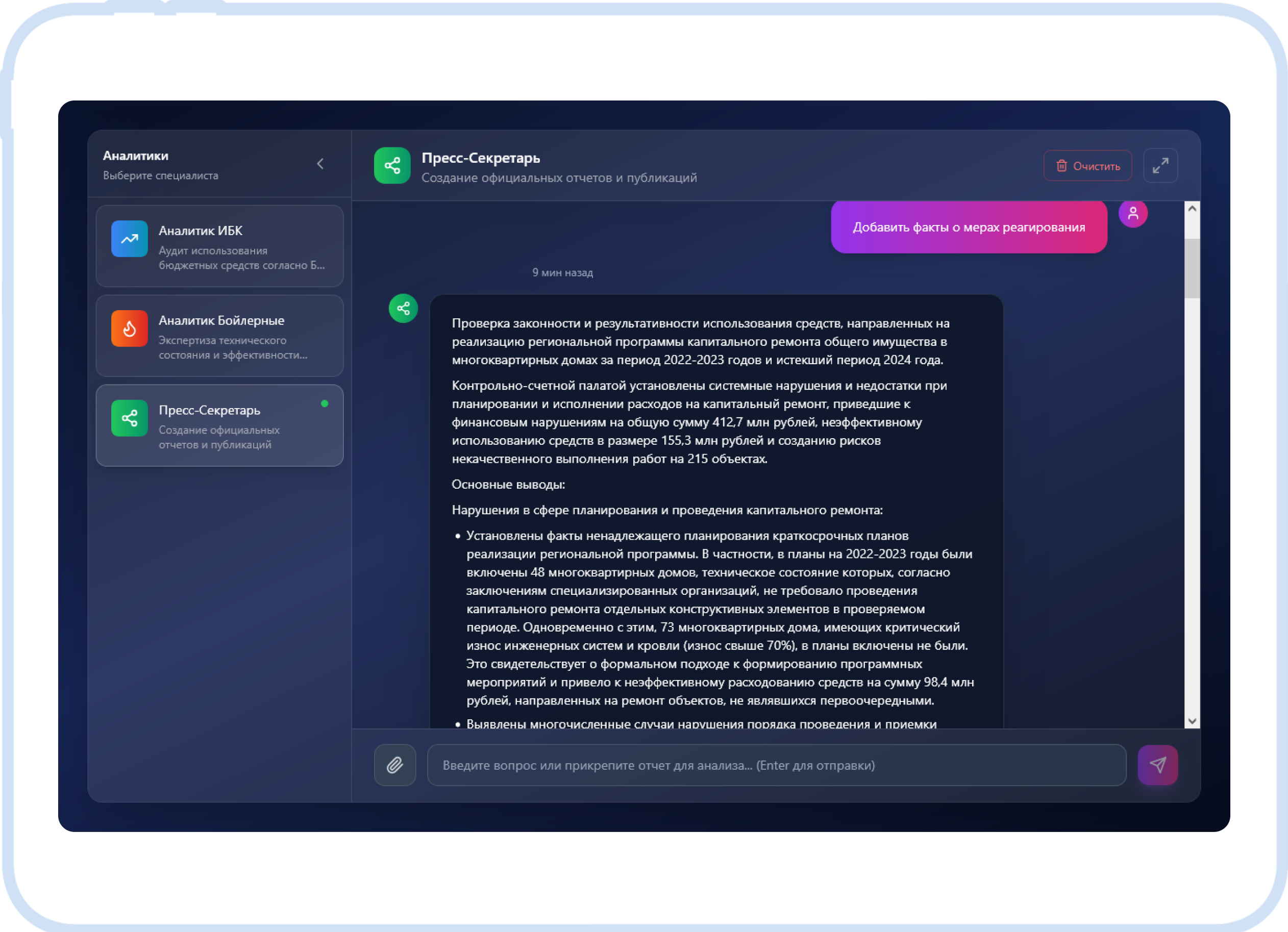 Мы разработали автоматизированное решение на базе ИИ-агентов, которое позволяет не только ускорить проведение аудита, но и автоматически формировать необходимые материалы для представления в прокуратуру, следственные органы, а также пресс-релизы для СМИ в случае, если аудит выявил нарушения.