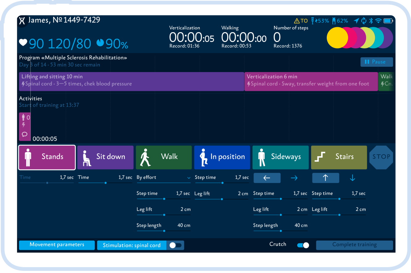 • Exoskeleton adjustment and calibration in service mode (adapting the exoskeleton to the patient takes no more than 10 minutes)