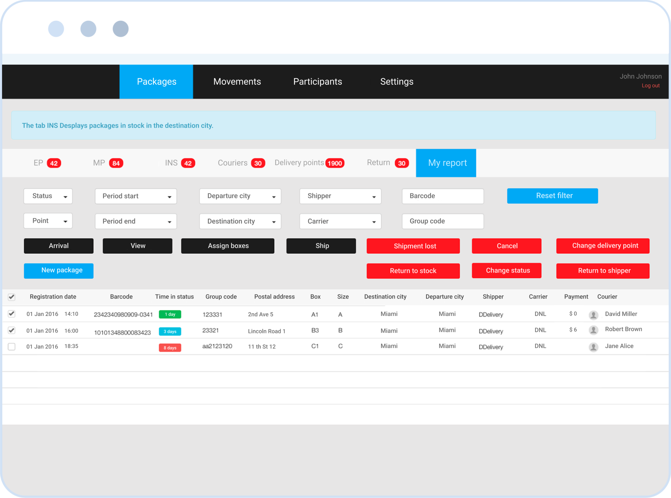 • Information about parcels: registration date, barcode, city of departure and destination, carrier, etc.